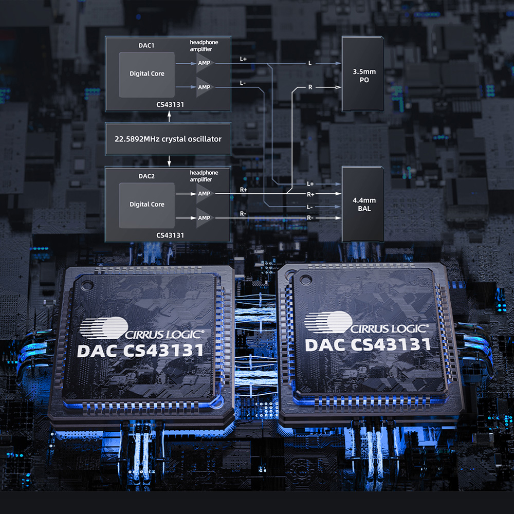 Svaki kanal je zasebno obrađivan od strane posebnog high-end Cirrus Logic CS43131 DAC-a. Ovo efikasno smanjuje ukrštanje signala (crosstalk) i omogućava viši kvalitet i čistiji zvuk.