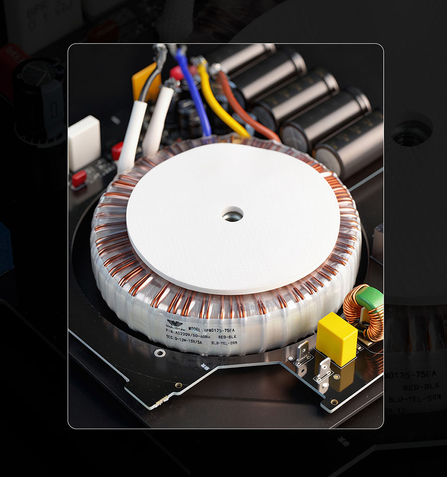 Posebno dizajniran za audio sisteme sa niskim nivoom šuma, ovaj toroidalni transformator koristi kružno jezgro od orijentisanog silicijumskog čelika, što obezbeđuje veću efikasnost i smanjene vrtložne struje. Konstrukcija kalema bez spojeva i pregiba omogućava ravnomerno magnetno polje i minimalno rasipanje fluksa. Sa rezervom snage od 75 W, bez napora odgovara na dinamičke tranzijente, pružajući čvrst i dubok bas, uz jasno definisanu i prostranu zvučnu scenu.