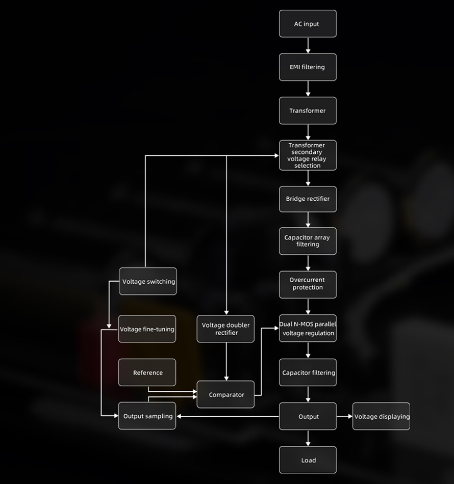 Integrisani relej upravlja izlaznim naponom transformatora kako bi obezbedio precizno usklađivanje sa 12 V i 15 V režimima rada. Ovakvo rešenje maksimizuje energetsku efikasnost i značajno smanjuje zagrevanje tokom rada.