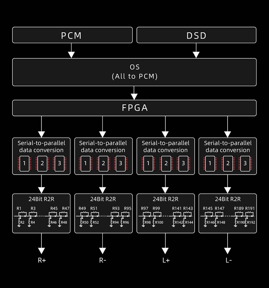 Da bi se dočarao klasični audio karakter vintage prenosnih CD plejera, DM15 R2R je opremljen sopstvenim četvorokanalim, potpuno diferencijalnim 24-bitnim R2R DAC-om sa nizovima otpornika. Napravljen je od ukupno 192 precizna tankofilmska otpornika (48 po kanalu), pažljivo odabrana zbog tačnosti od 0,1% i niskog temperaturnog pomeranja (30 ppm). Rezultat je topao i prirodno analogni zvuk.