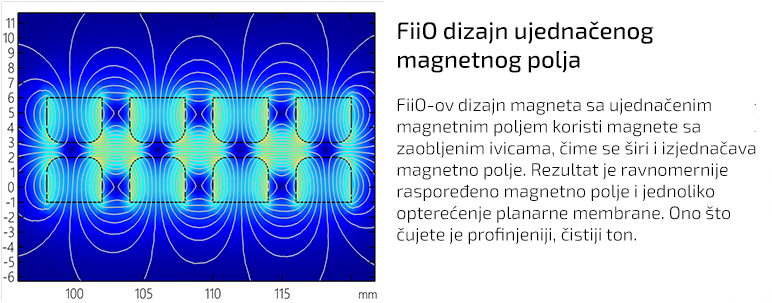 Analiza metodom konačnih elemenata pokazuje da tradicionalni pravougaoni magneti stvaraju neujednačena magnetna polja – neka područja su izrazito snažna, dok su druga slabija. To dovodi do toga da glasovna zavojnica trpi neujednačene sile u magnetnom polju, što može izazvati nestabilno kretanje drajvera i posledično izobličenje zvuka. FT7 koristi FIIO-ovu patentiranu akustičnu tehnologiju – dizajn ujednačenog magnetnog polja. Optimizacijom rasporeda magnetnog kola i upotrebom magneta sa zaobljenim ivicama, postignuto je ravnomerno magnetno polje koje obezbeđuje da svi delovi membrane planarnih slušalica budu jednako opterećeni. Na taj način smanjuje se raspad kretanja drajvera i minimizira distorzija.