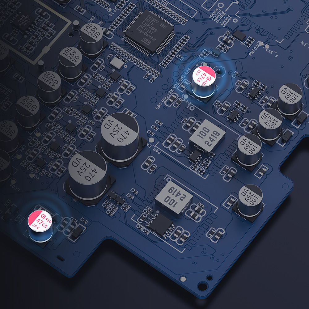 Ovi kondenzatori sa izuzetno niskim ESR-om (ekvivalentni serijski otpor), u kombinaciji sa odličnom otpornošću na elektromagnetne smetnje, omogućavaju stabilno i čisto napajanje — što je ključno za postizanje vrhunskog kvaliteta zvuka.