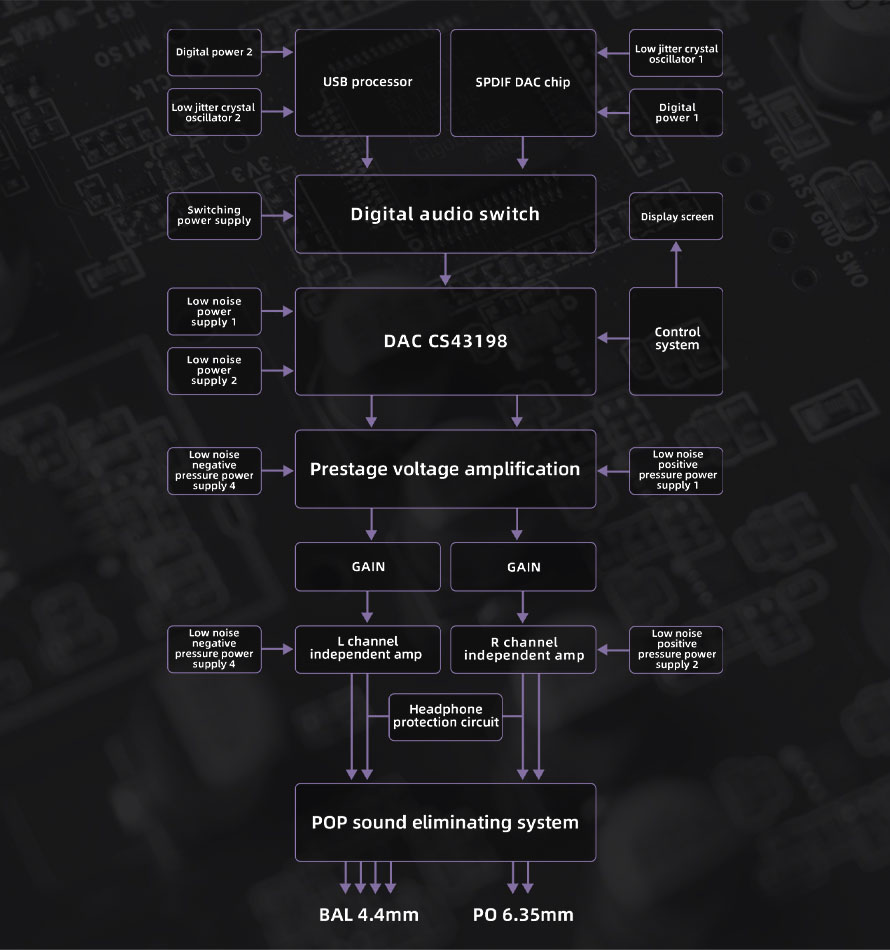 Unutar kompaktnog kućišta modela K11 nalazi se posebno razvijen audio sklop osmišljen za vrhunski kvalitet zvuka. Podržan je sa više od 16 LDO regulatora niskog šuma, koji obezbeđuju preciznu stabilizaciju napona, dok se napaja putem eksternog 12 V switching napajanja. Sve to rezultira čistijim i stabilnijim napajanjem, što omogućava dosledan, visok kvalitet zvuka i zaista prijatno muzičko iskustvo u svakom trenutku.