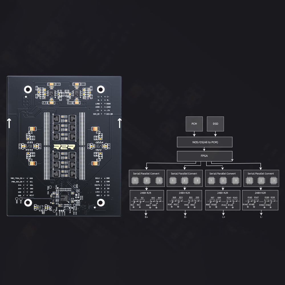 FiiO-ov novi, samostalno razvijeni četvorokanalni diferencijalni 24-bitni Resistor-To-Resistor DAC koristi po dva niza od 48 preciznih otpornika po kanalu – ukupno 192 otpornika sa tolerancijom od 0,1% i niskim temperaturnim odstupanjem (30ppm). Kod R2R tehnologije se digitalno-analogna konverzija obavlja preko mreže otpornika, umesto preko uobičajenog konverterskog čipa. Ova konfiguracija donosi jedinstven i izražajno topao zvuk.