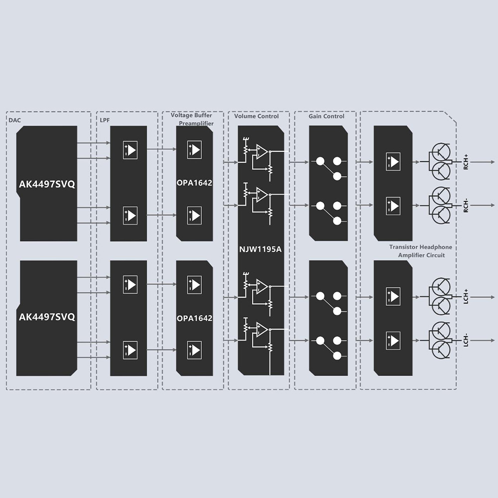 Od dekodiranja DAC-a, low-pass filtriranja, kontrole pojačanja, pa sve do pojačala za slušalice, audio sklop FiiO K15 je potpuno diferencijalnog dizajna. Takav dizajn obezbeđuje širok dinamički opseg, istovremeno efikasno smanjujući preslušavanje kanala, minimalizujući šum i poboljšavajući kvalitet zvuka.