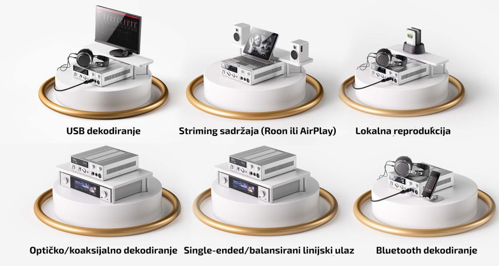 *Digitalni ulazi uključuju USB, koaksijalni, optički, Bluetooth, streaming medija i lokalnu reprodukciju.