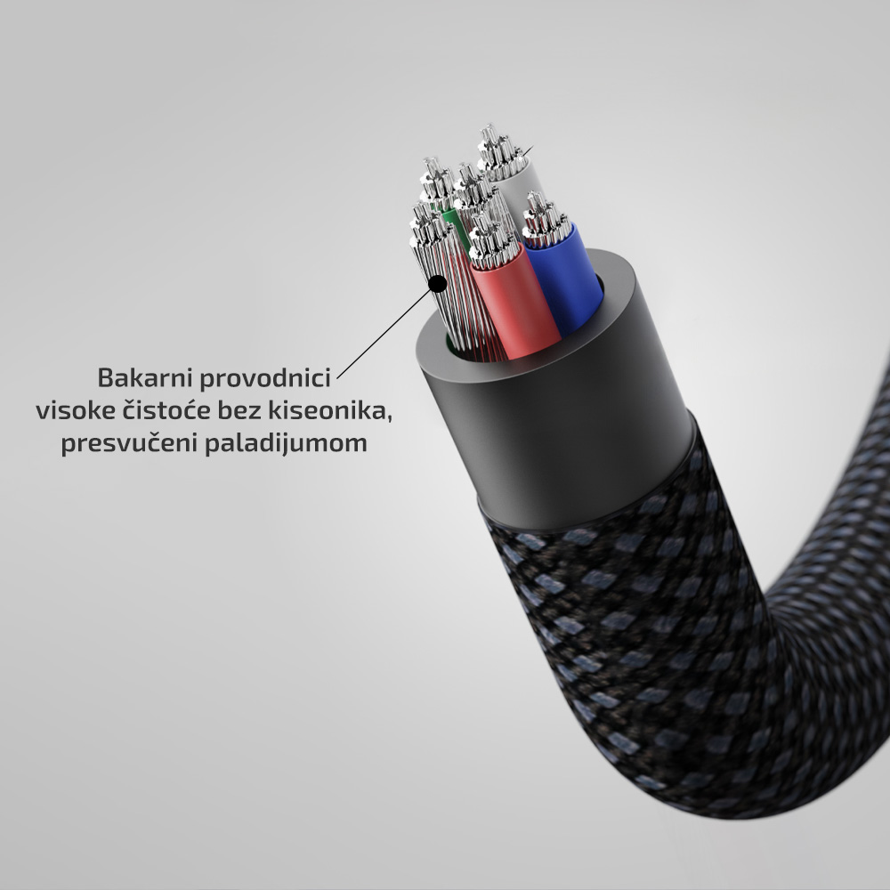 Kabl je napravljen od visokoprovodnih bakarnih provodnika presvučenih paladijumom, koji omogućavaju nisku impedansu, brzo prenošenje signala i otpornost na spoljne smetnje. Bakarne žice su obložene slojem fleksibilnog silikona i pletene tkanine, što rezultira kablom koji je istovremeno mekan i izdržljiv.