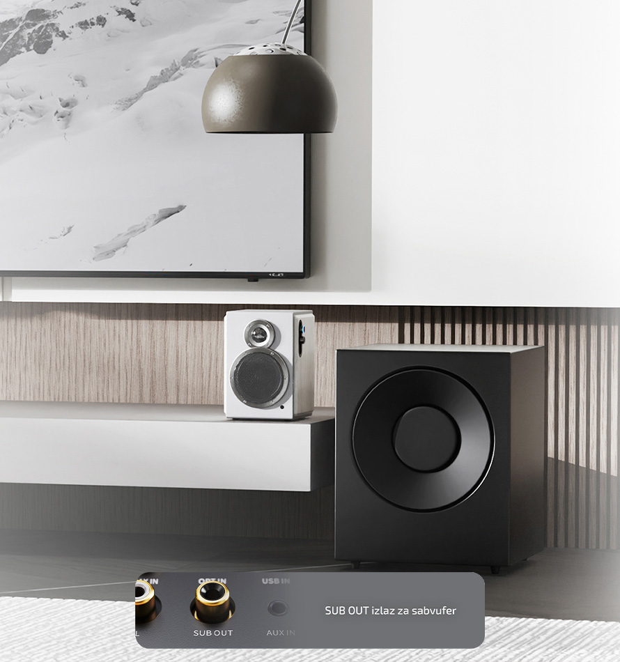 Zahvaljujući velikoj potražnji, SA1 je opremljen RCA izlazom za sabvufer. Povežite aktivni sabvufer putem SUB OUT priključka i formirajte 2.1 sistem, za bolji bas čak i u većim prostorijama.