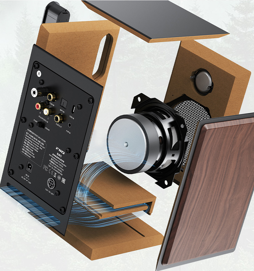 Iako je SA1 proizvod početnog nivoa, njegov vufer je iste veličine od 3,5 inča kao kod FiiO SP3/SP3 BT i izrađen je istim procesom od drvenih vlakana kao kod FiiO FT1 drvenih slušalica. Membrana od čistih vlakana je lagana, ali čvrsta i pruža bogat zvuk. Prilagođavanjem materijala pulpe, odnosa i proporcije dugih i kratkih vlakana, membrana je učvršćena i zvuk dodatno fino podešen. Vufer od drvenih vlakana pruža pun i bogat zvuk. Zbog ovih prednosti, nije iznenađenje što mnogi poznati brendovi i danas koriste ovakve drajvere u svojim zvučnicima. Pored toga, 3,5-inčni vufer je uparen sa velikom fleksibilnom suspenzijom od 75 mm, što omogućava reprodukciju basa do 65 Hz.