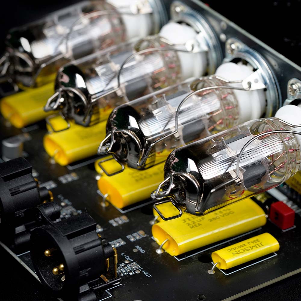 U središtu cevnog buffer stejdža nalaze se četiri potpuno nove JJ Electronic E88CC lampe uvezene iz Slovačke. Napajane su stabilnim +28V napajanjem i nude izuzetno dug vek trajanja od 10.000 sati. Jezgro klasičnog buffer pretpojačala je dodatno optimizovano kako bi pružilo topao, organski karakter cevi – dodajući muzici prijatnu punoću i bogat, zaobljen ton.