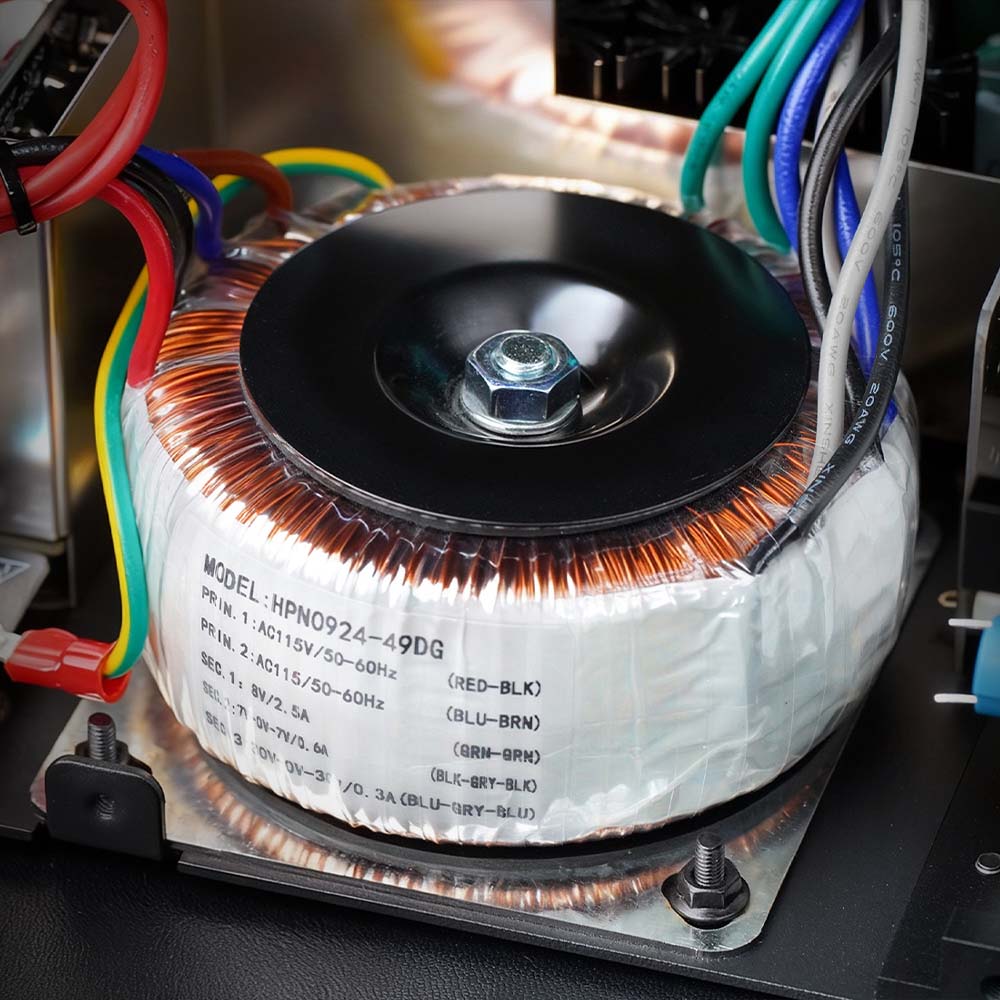 U srcu uređaja nalazi se 46W linearni toroidalni audio transformator sa niskim šumom i niskim ripplom, koji obezbeđuje izuzetno čisto napajanje. Toroidni transformatori imaju prirodne prednosti: jezgro od neorijentisanih silicijumskih čeličnih traka omogućava visoku efikasnost i minimalne vrtložne gubitke, dok namotaji bez oštrih ivica obezbeđuju ujednačeno magnetno polje i manja curenja.