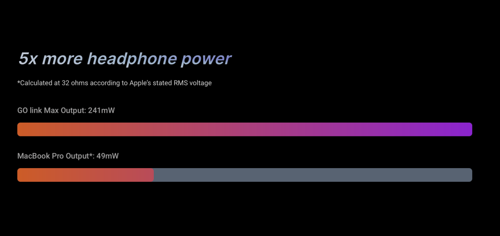 Savremeni prenosivi uređaji poput pametnih telefona često prave kompromis u pogledu performansi slušalica, jer mnogi nemaju priključak za slušalice ili nude ograničen izlaz putem adaptera. GO link Max rešava ovaj problem sa do 241 mW izlazne snage - pet puta više od izlaza za slušalice na MacBook Pro-u. Ova povećana snaga ne samo da pojačava jačinu zvuka, ona otključava pun potencijal vaših slušalica, pružajući fine detalje i definiciju za izuzetno iskustvo slušanja.