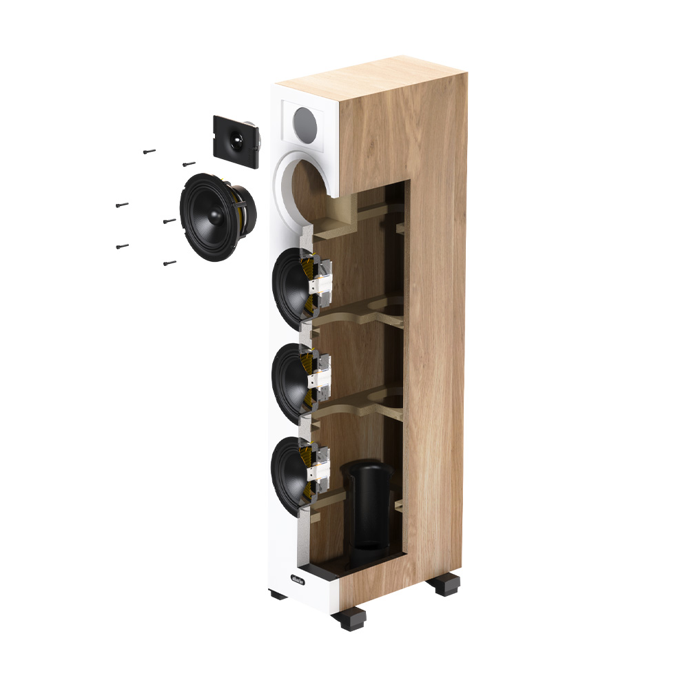 Unutrašnjost skriva četiri ukrštene ojačanja koja povezuju sve zidove kućišta, kao i zasebnu zaptivenu komoru za srednjotonski drajver. Ovakva struktura sprečava prenos unutrašnjih vibracija na zidove kućišta.