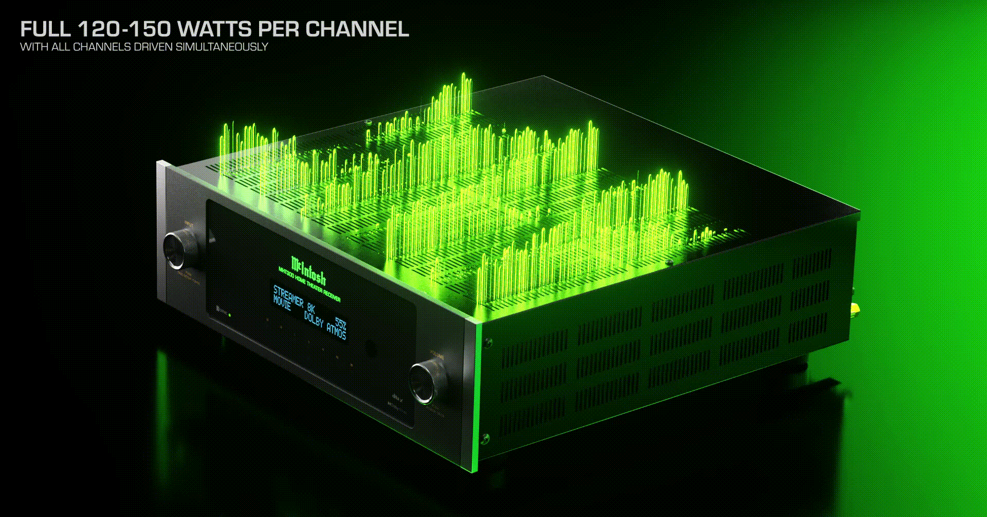 Nemojte se zavaravati visokom snagom po kanalu koje navode mnogi drugi AV risiveri na tržištu, jer će često sitni tekst pokazati da se ti podaci o snazi odnose samo na dva aktivna kanala. To može biti u redu za stereo postavku, ali kućni bioskop ima puno više od samo dva kanala za pogon. Sa MHT300, ocene snage odnose se na pogon svih sedam kanala. To znači da će svaki zvučnik od 4 Ω dobiti 150 vati, a svaki zvučnik od 8 Ω dobiti 120 W snažnog McIntosh napajanja kako bi oživeli sve vaše omiljene filmove i video sadržaje. Svaka eksplozija, svaka potera automobila, svaki brzi prelet lovačkog aviona ili svemirskog broda, svaki urlik publike nakon postignutog pobedonosnog poena biće verno reproduktovan sa 120 – 150 W na svakom od vaših zvučnika. Sa MHT300, više nećete morati da se pitate da li svaki zvučnik dobija punu snagu navedenu na kućištu.