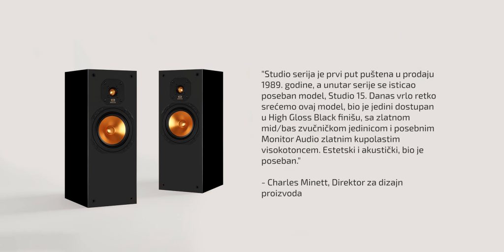Kabinet Studio 89-a ima završnicu od visokog crnog premaza sa zvučničkim jedinicama u zlatnoj boji. Ovo je omaž Studio 15, koji je bio jedini model u originalnoj Studio seriji dostupan u ovoj stilski privlačnoj kombinaciji. Studio 89 pruža impresivno veliki zvuk iz lepo obrađene kompaktne kutije.