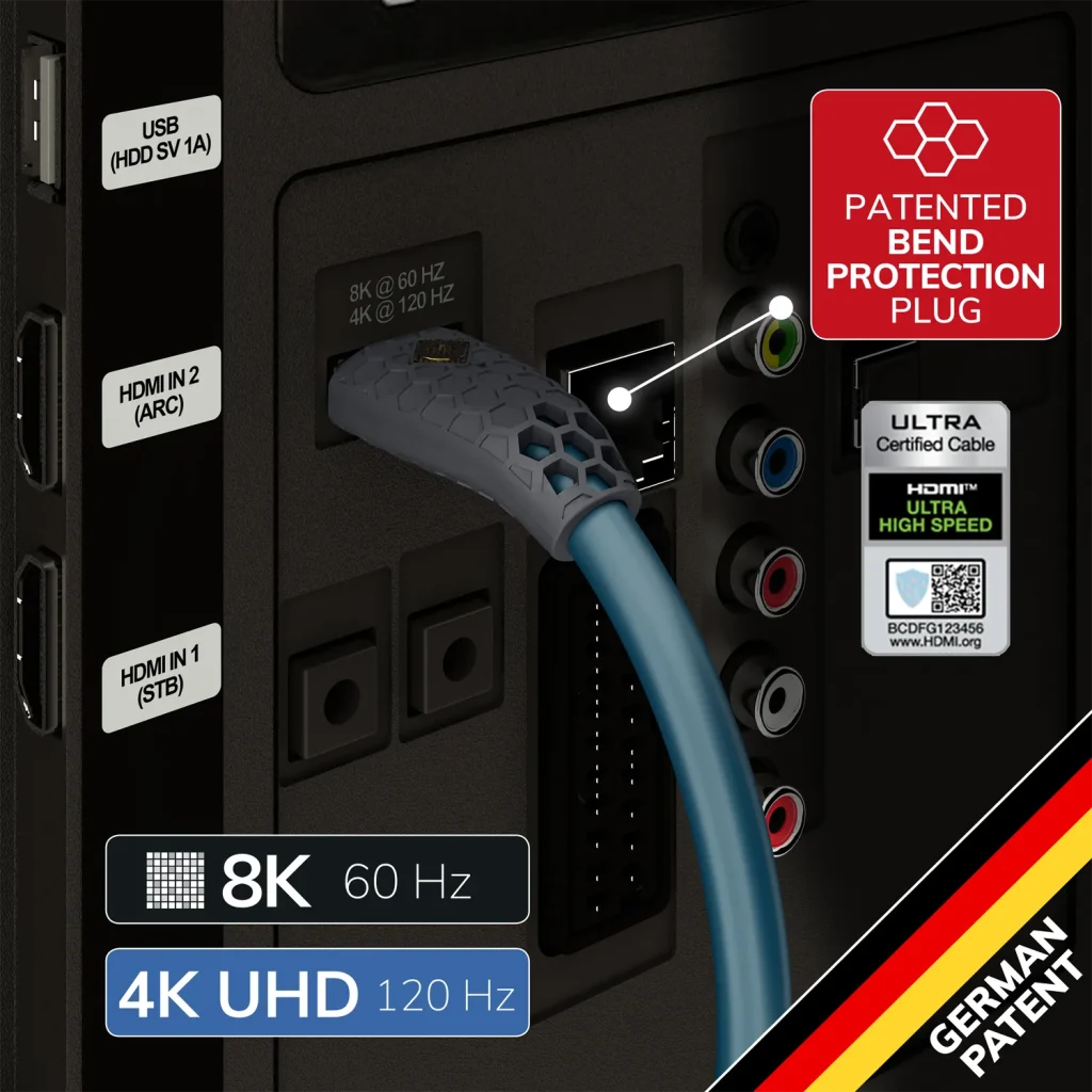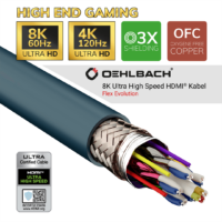 Oehlbach Flex Evolution Ultra High-Speed HDMI kabl nudi impresivan kvalitet u 8K pri 50/60 Hz ili 4K do 120 Hz. Opremljen je patentiranim konektorom sa integrisanom zaštitom od savijanja, koja štiti kabl od lomljenja i istovremeno skraćuje kućište konektora. Kabl je bez PVC-a i izrađen isključivo od TPE (termo-plastične gume). Visokokvalitetni OFC provodnik, trostruka zaštita i pozlaćeni priključci od 24 karata garantuju besprekornu signalnu transmisiju.