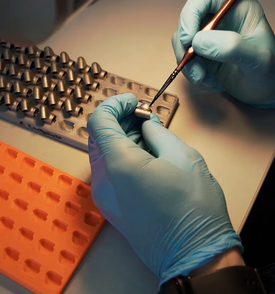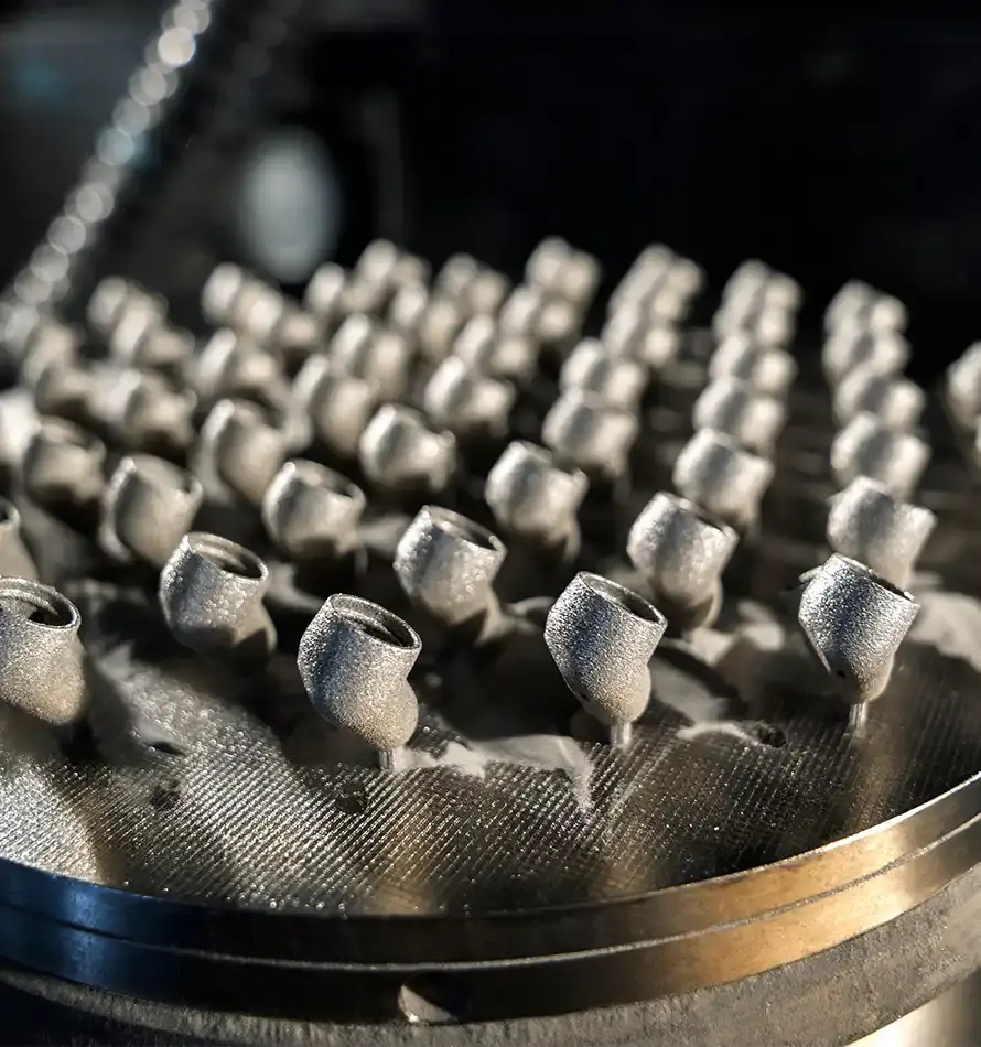 Računarski kontrolisan laser sinteruje tanak sloj metalnog praha, spajajući istopljenu leguru sa već očvrsnutim slojem ispod nje. Sloj po sloj, deo se gradi do svog konačnog oblika. Nakon toga, tehničar ručno uklanja sve tragove nastale tokom procesa proizvodnje.