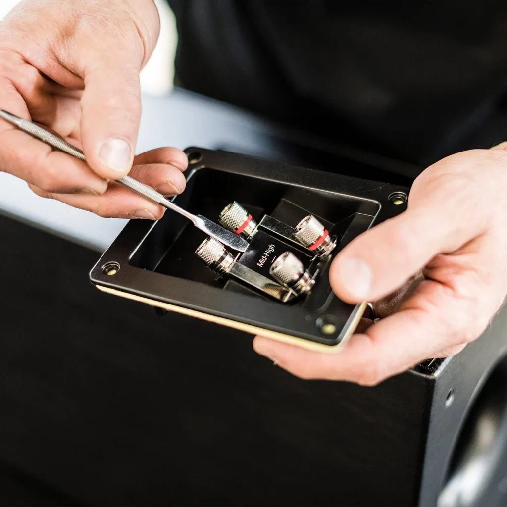 Lumina V je opremljena sa dva para niklom presvučenih terminala, što omogućava nadogradnju sistema putem bi-wiring ili bi-amping povezivanja.
