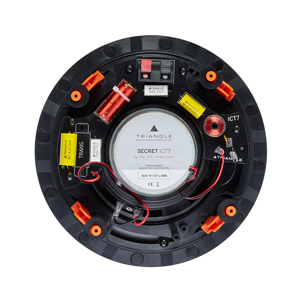Triangle Secret ICT7 su okrugli zvučnici opremljen sa drajverom od 170 mm i podesivim svilenim visokotoncem od 25 mm za ukupan prečnik od 246 mm. Koaksijalni raspored pruža odličnu doslednost u celom frekvencijskom opsegu (od 55Hz do 20kHz).