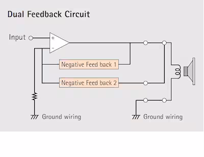 Ugrađeno pojačalo obezbeđuje stabilan izlaz od 130 W uz visoku efikasnost, uz minimalnu potrošnju energije i smanjeno zagrevanje. Nema potrebu za izlaznom zavojnicom za filtraciju, što rezultira izuzetno niskim šumom i izobličenjem. Takođe, brz odziv na promene signala je odličan. Dvostruka povratna sprega dodatno smanjuje izobličenja, čime se postiže veća jasnoća zvuka.